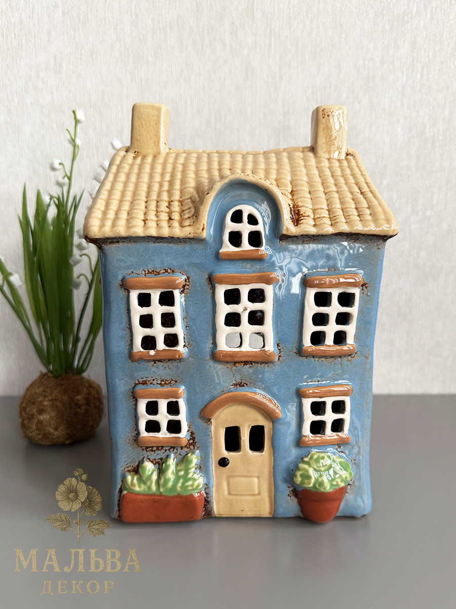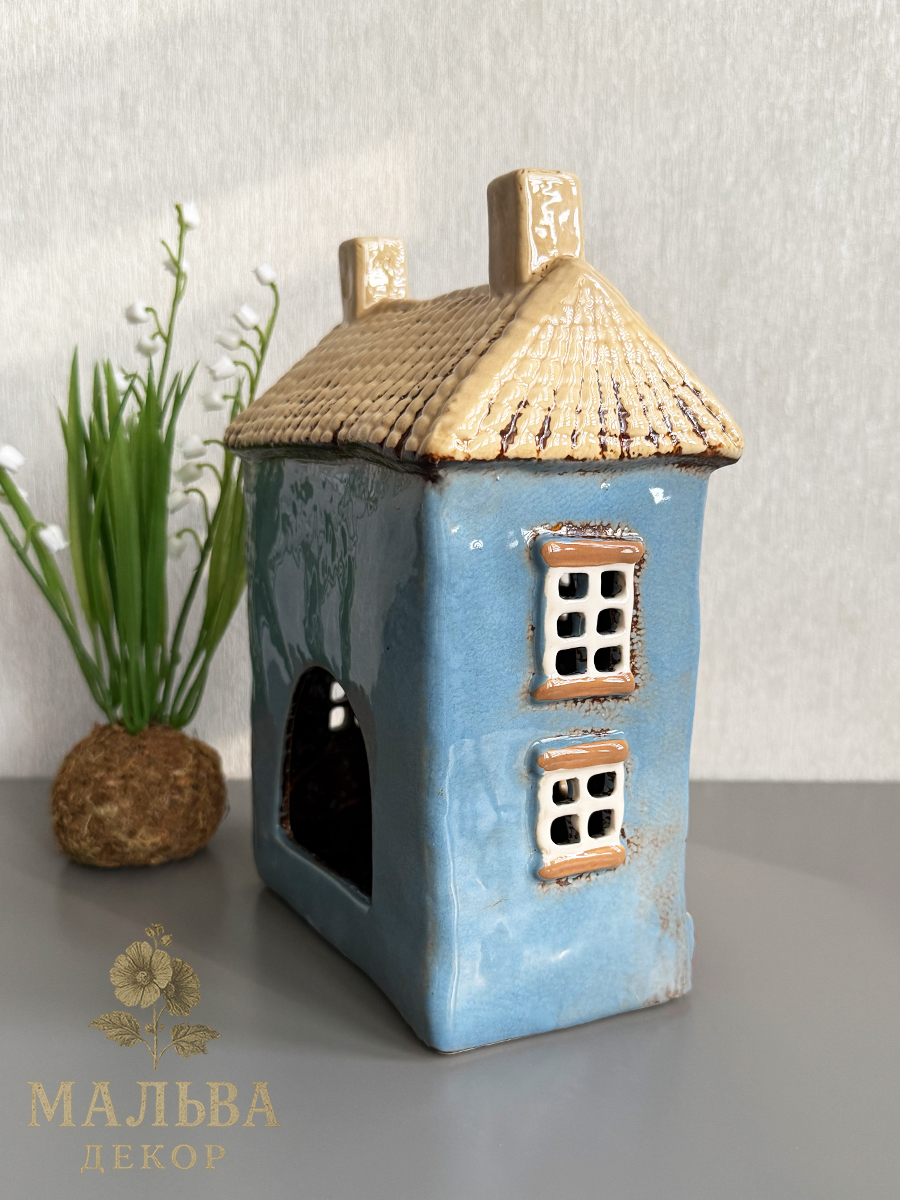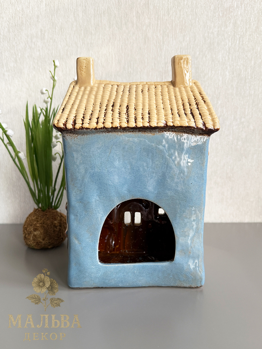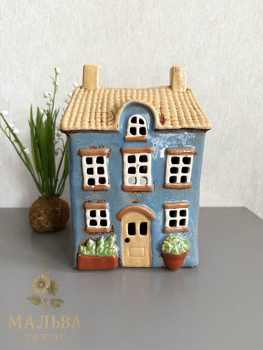 Керамический домик подсвечник от Clayre & Eef в нежно-голубом цвете для чайной свечи или светодиодной гирлянды.