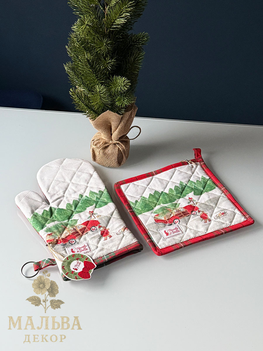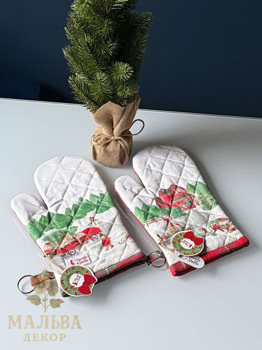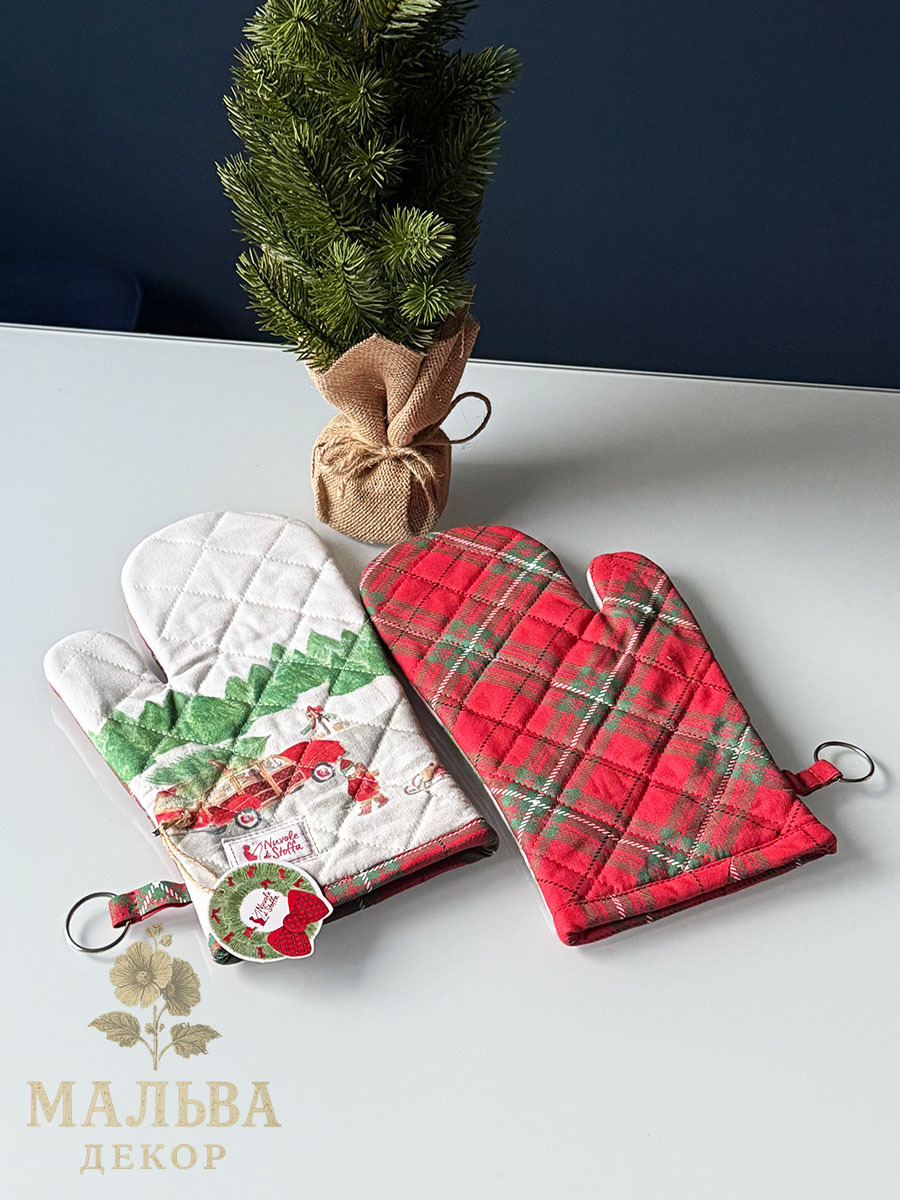 Принт прихватки с рождественскими мотивами и традиционной новогодней клетки станут милым подарком коллегам, знакомым, подругам.