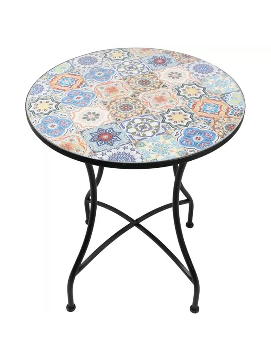 В классическом стиле с нотками марокканского стиля гармонично сочетаются металл и керамика. Нежные пастельные тона, узнаваемые мотивы керамической плитки. Удобные габариты (60x60x71 см) позволяют разместить столик даже в небольшом пространстве – будь то гостиная или садовый участок.
