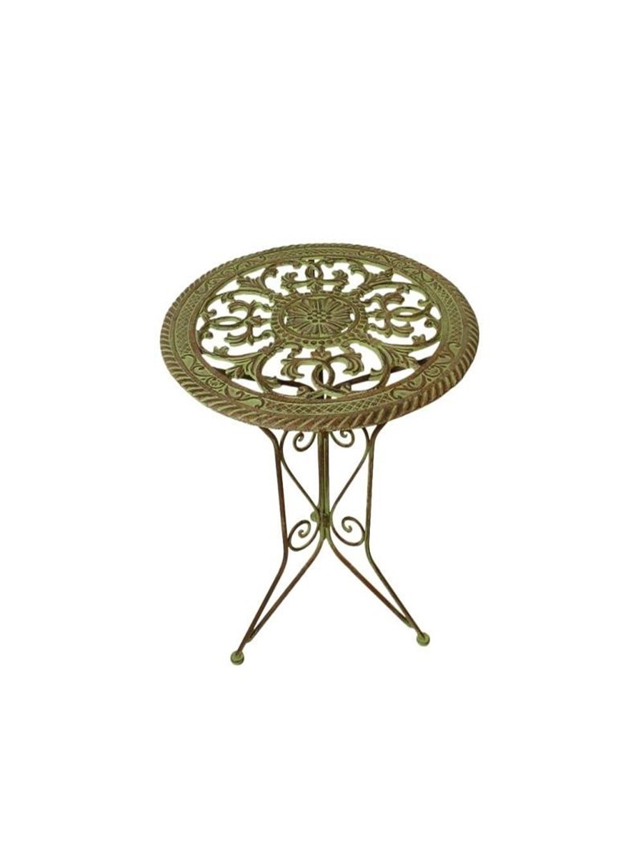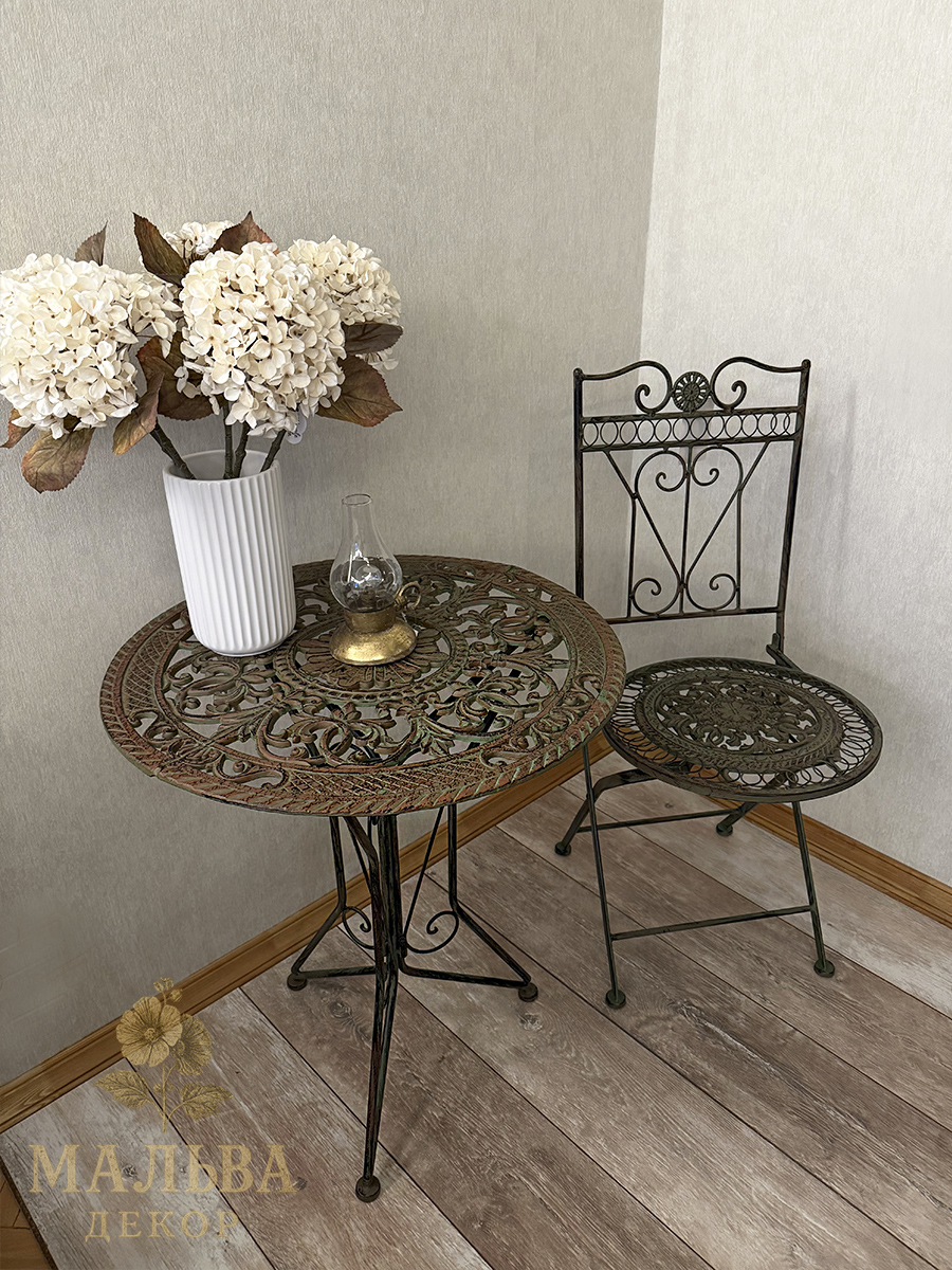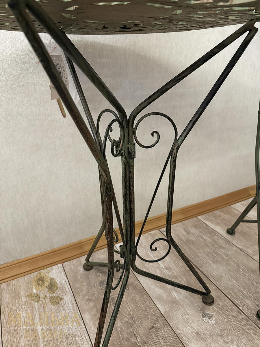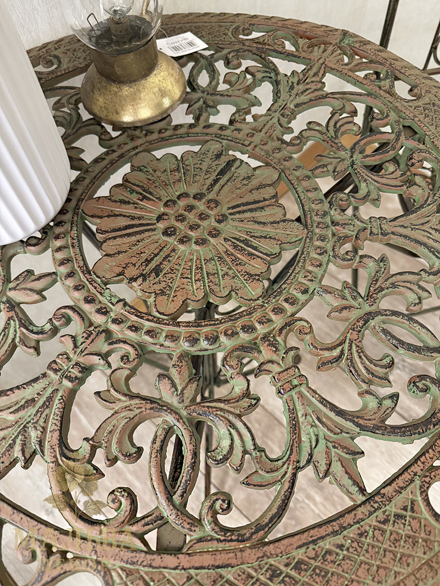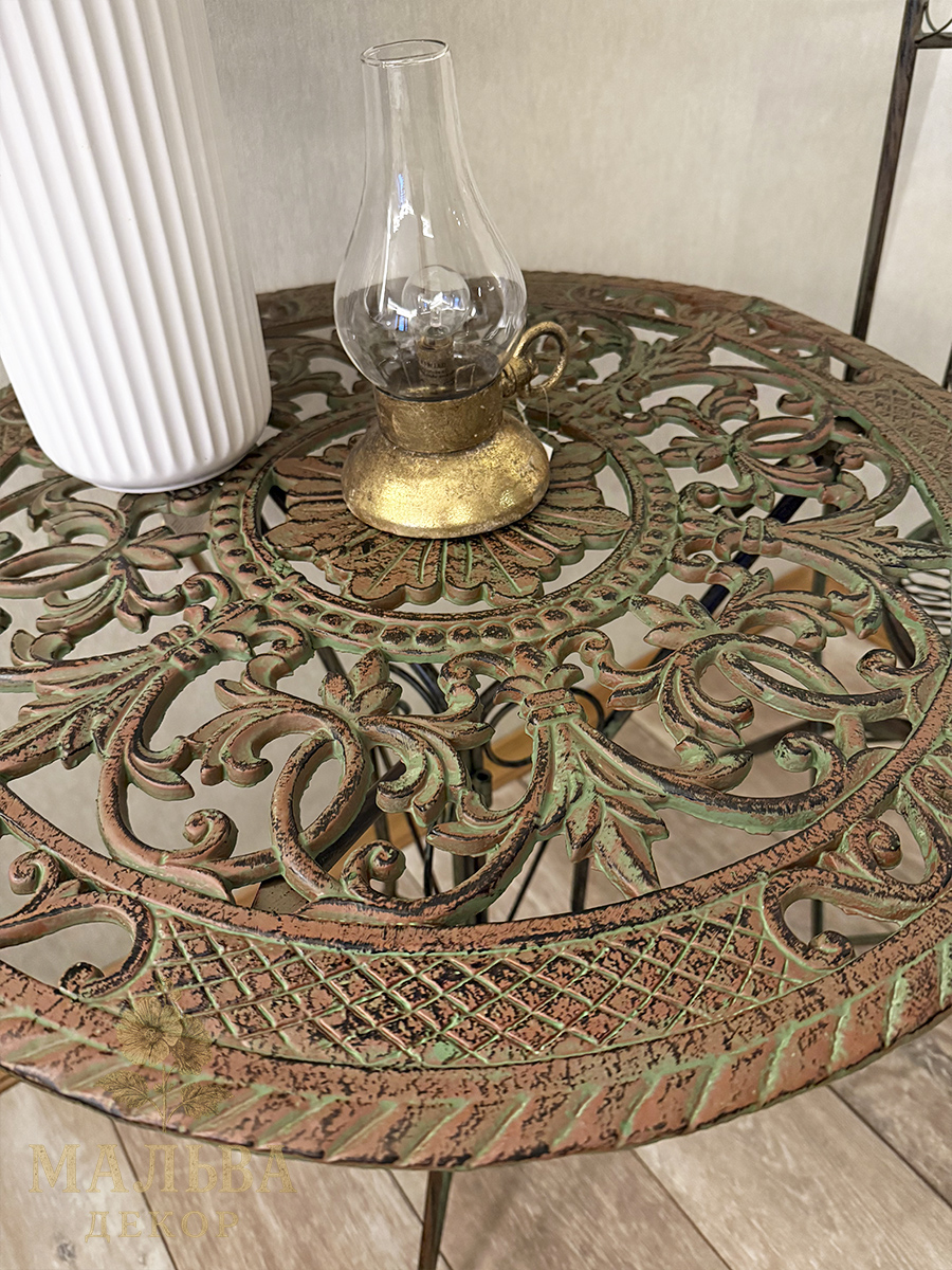 Классический круглый металлический стол в коричнево-зеленом цвете станет центральным украшением в доме, на даче или саду.