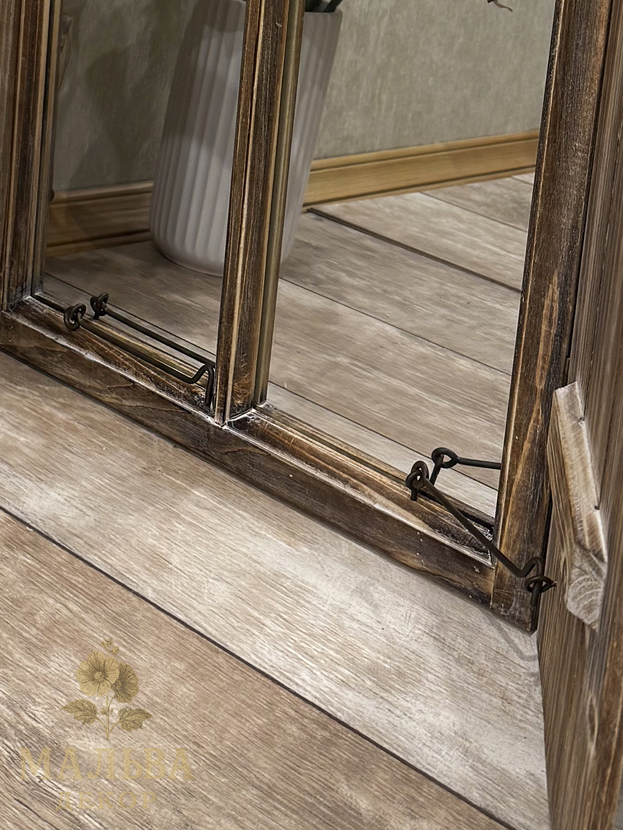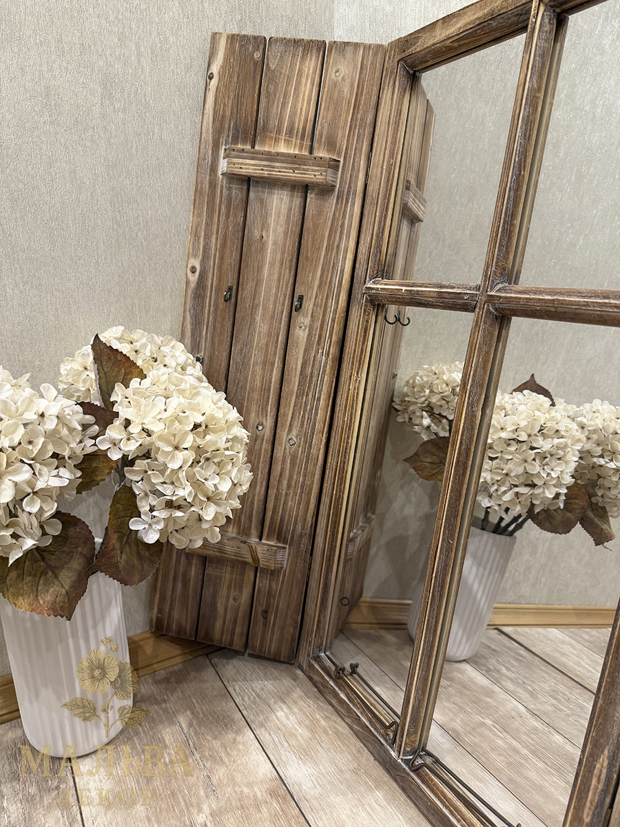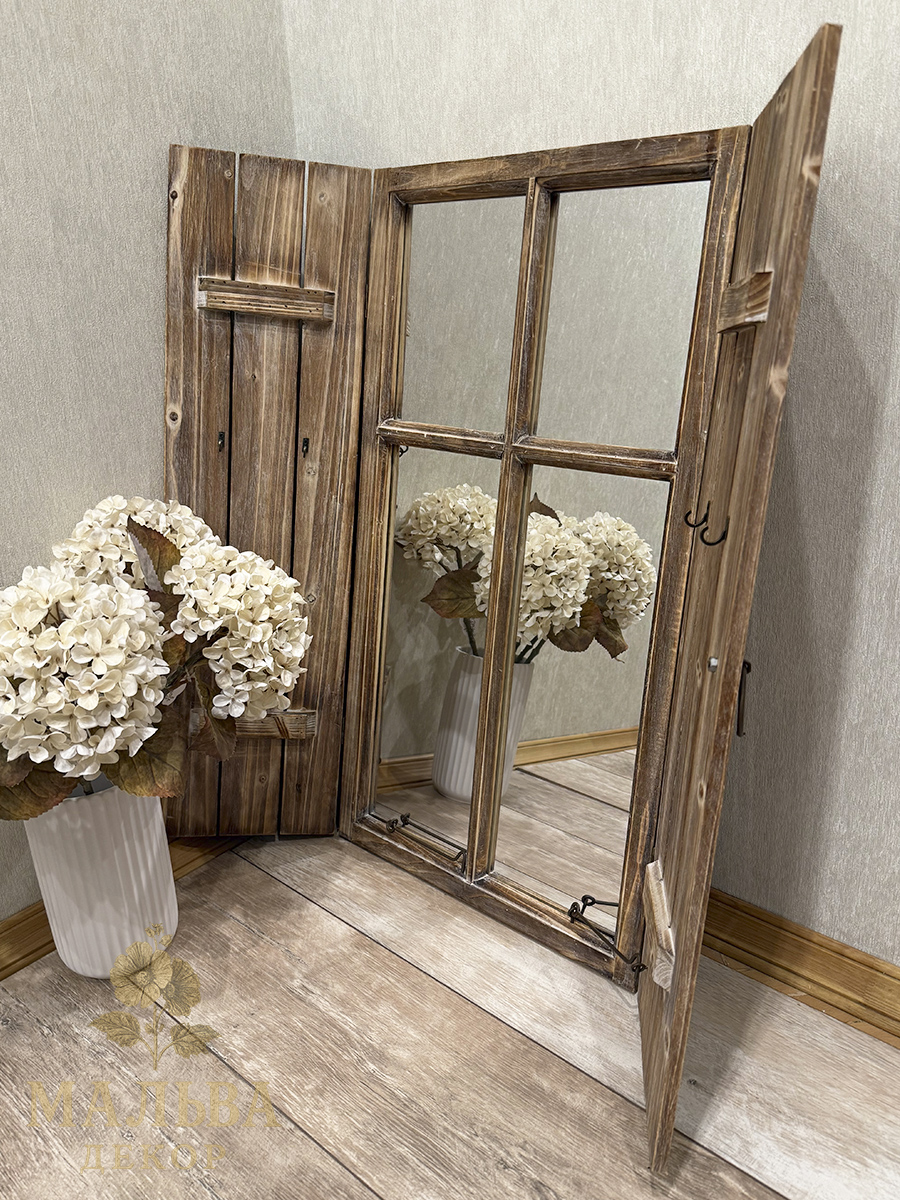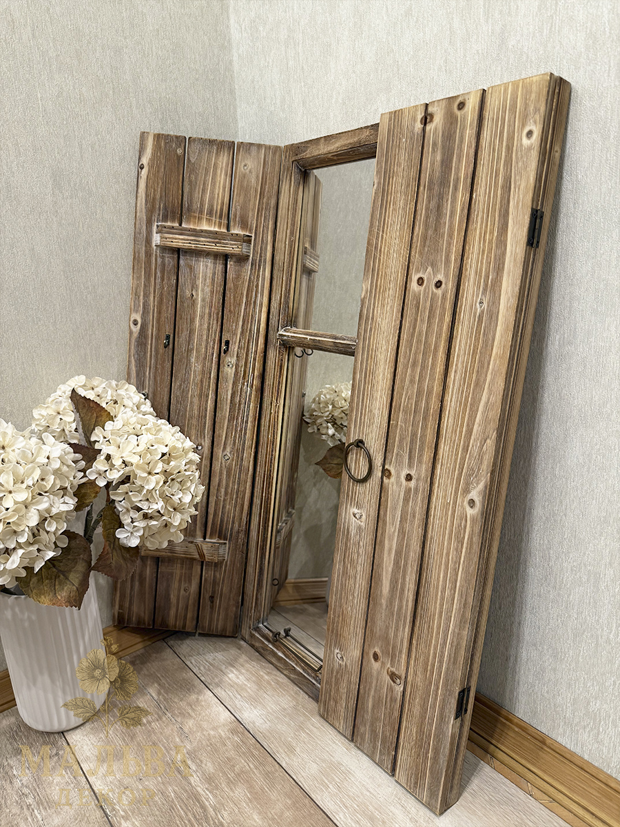 Сделано из загорелого переработанного дерева и зеркала, размеры 42x4x77 см идеально впишутся в любое пространство. Ставни окна открываются, с внутренней стороны на ставнях с двух сторон есть крючки.